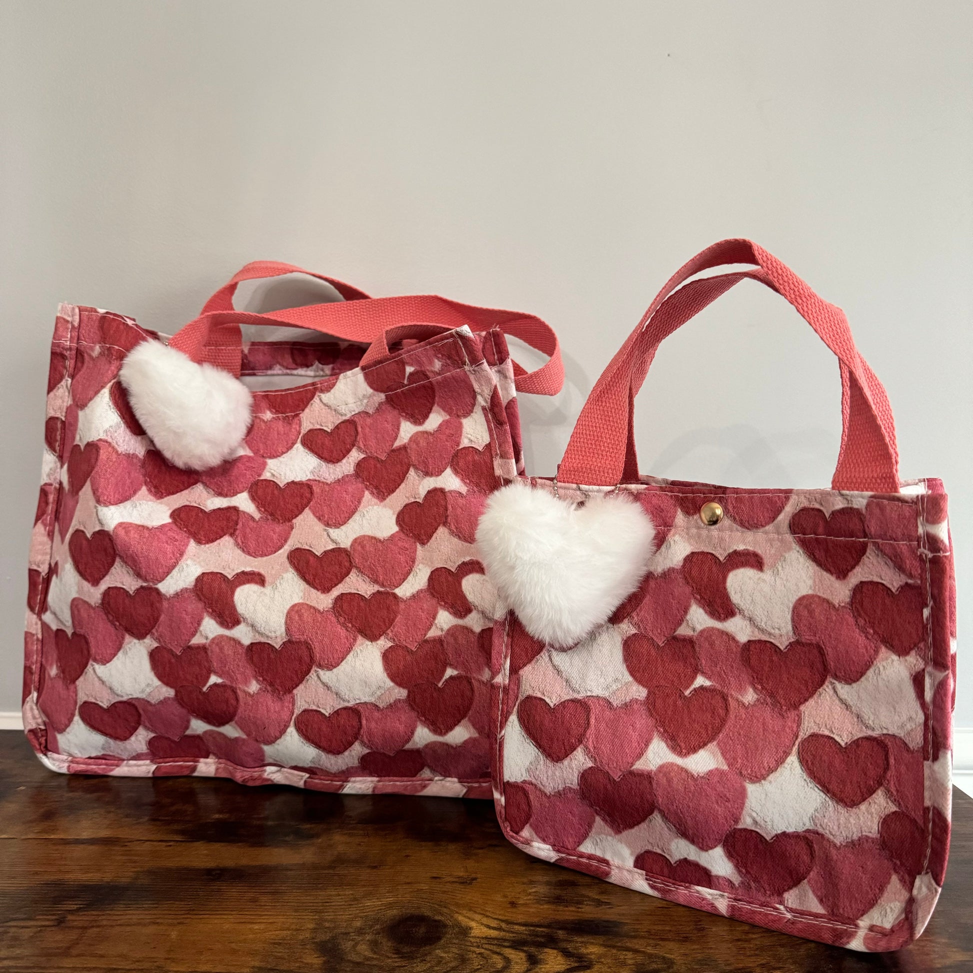 The cutest tote bags are ready for anything. Available in a small and large size, you can pick what suits your needs or do a “mommy and me” set! Comes with white Pom Pom heart keychain.
